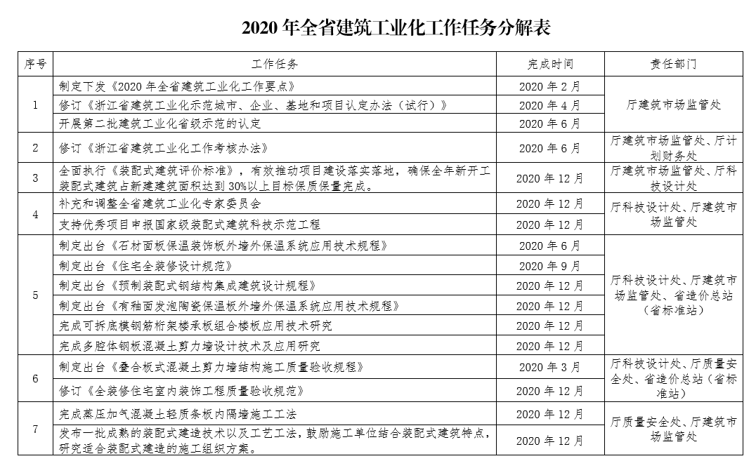 2020年3月2日,浙江省住建厅发布《2020年全省建筑工业化工作要点》(下文简称为《要点》),该《要点》进一步明确并分解了2019年7月浙江省提出的相关目标。